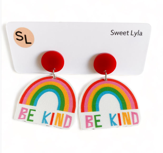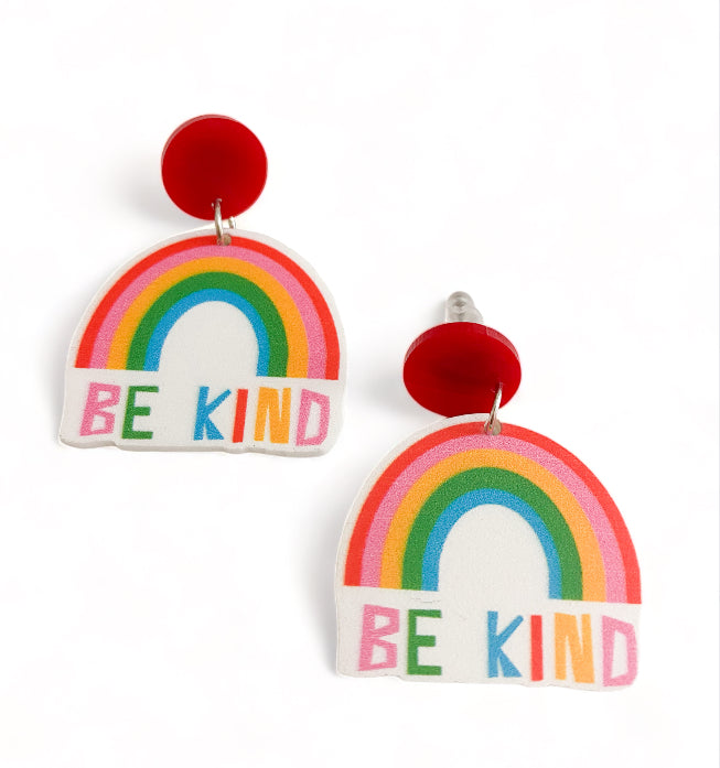 Introducing "Be Kind Rainbows" earrings: Spread positivity with these charming and colorful dangle earrings. Named for their uplifting message, they feature stainless steel ear posts for durability and comfort. Made from acrylic, these earrings boast solid color dangles with a delightful arched rainbow accent, serving as a colorful reminder to be kind. With a length of 4 cm and a maximum width of 3 cm, they offer a playful yet wearable accessory option. Add a touch of positivity to your ensemble with "Be Kind Rainbows" earrings and inspire kindness wherever you go.