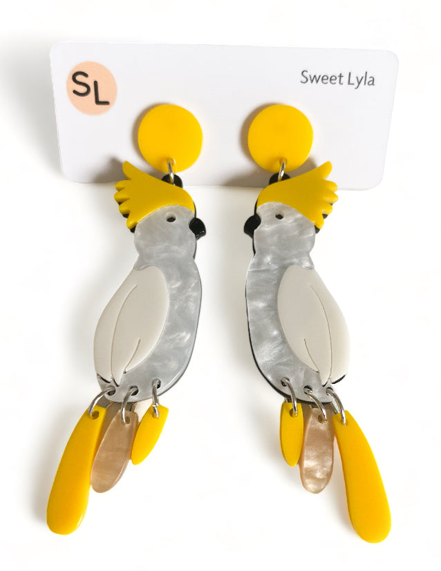 Introducing "Cockatoo" dangle earrings: Make a bold statement with these stunning and unique earrings. Named for their striking design inspired by the vibrant plumage of cockatoos, they feature stainless steel ear posts for durability and comfort. Crafted with meticulous attention to detail, these earrings are a true work of art, made with many layers of acrylic to create a dimensional look. With a length of 8.5 cm and a maximum width of 2 cm, they are sure to turn heads and add a touch of Australian birdlife to any outfit. Embrace your adventurous side with "Cockatoo" dangle earrings and let your style take flight.