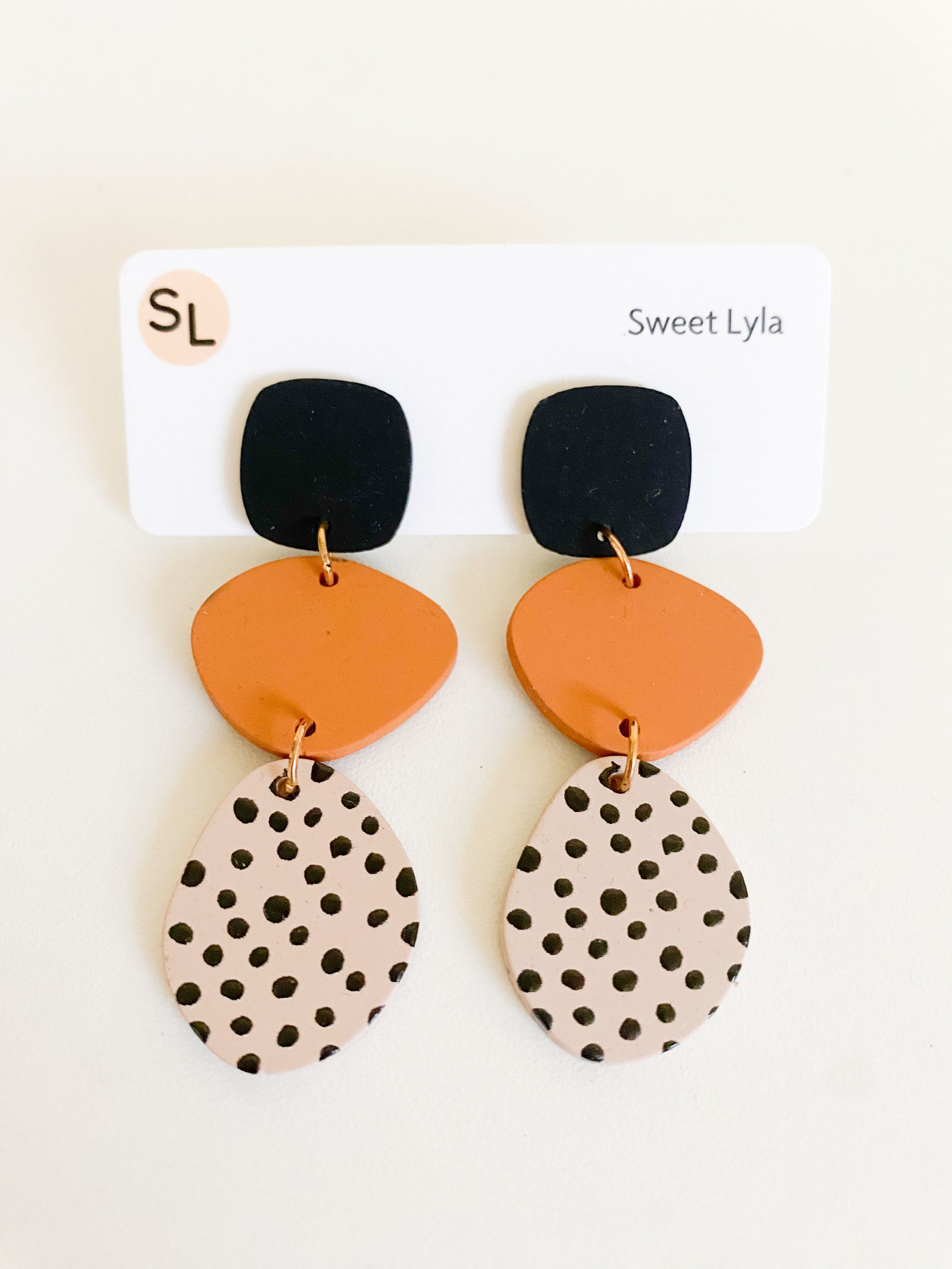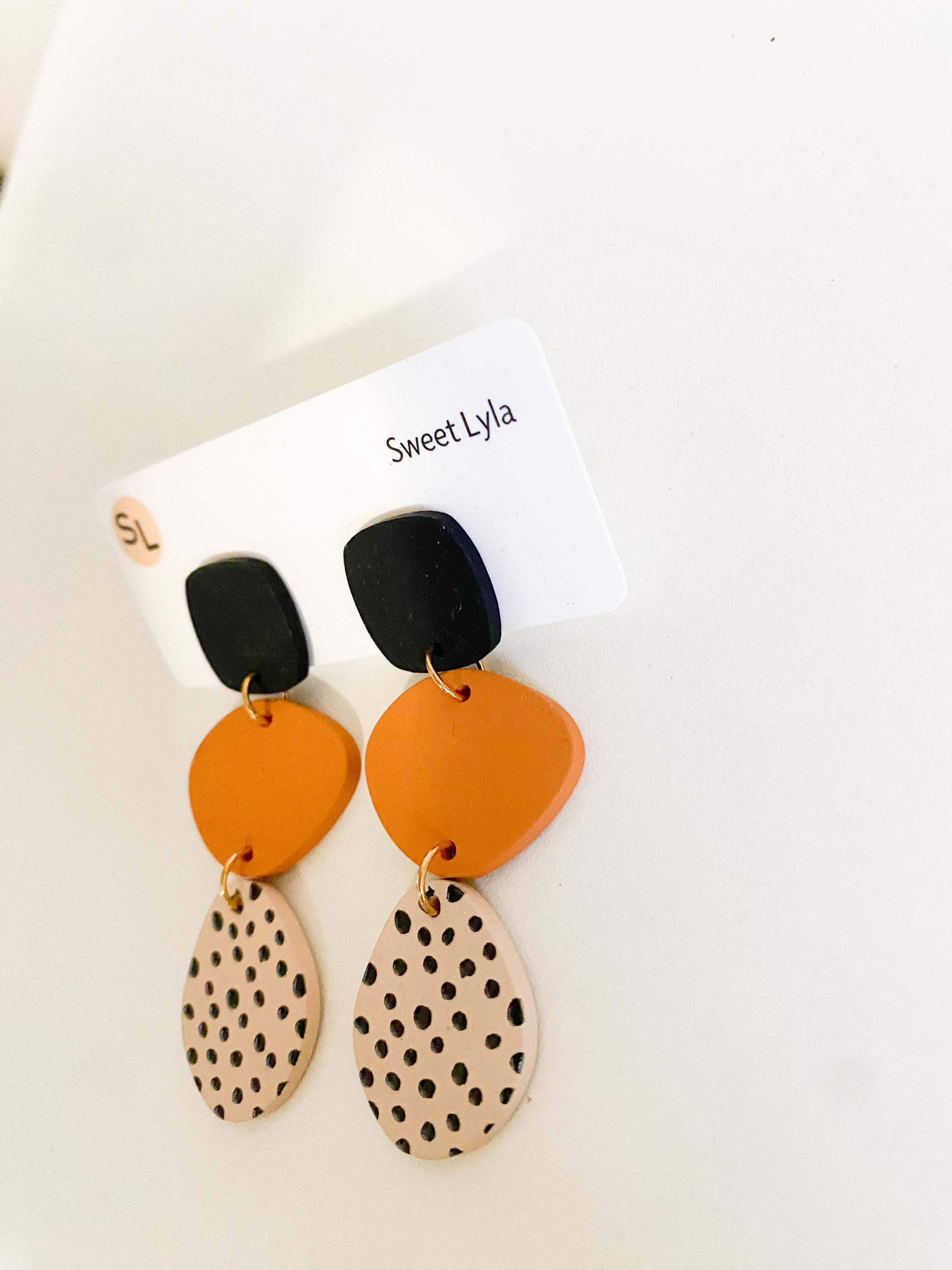 Introducing "Triple Everyday Dangles" earrings: Elevate your style with these playful and vibrant dangle earrings. One of our most popular pair of earrings purchased for teachers! Featuring stainless steel ear posts for durability, they boast a three-tier design with a black stud top, Mustard Tan Middle and a fun dot print pattern to finish. Made from acrylic, these earrings measure 6cm in length and have a maximum width of 2.5cm, offering a bold yet wearable accessory option. Add a touch of personality to your ensemble with "Fun Everyday Dangles" earrings and let your fun side shine.