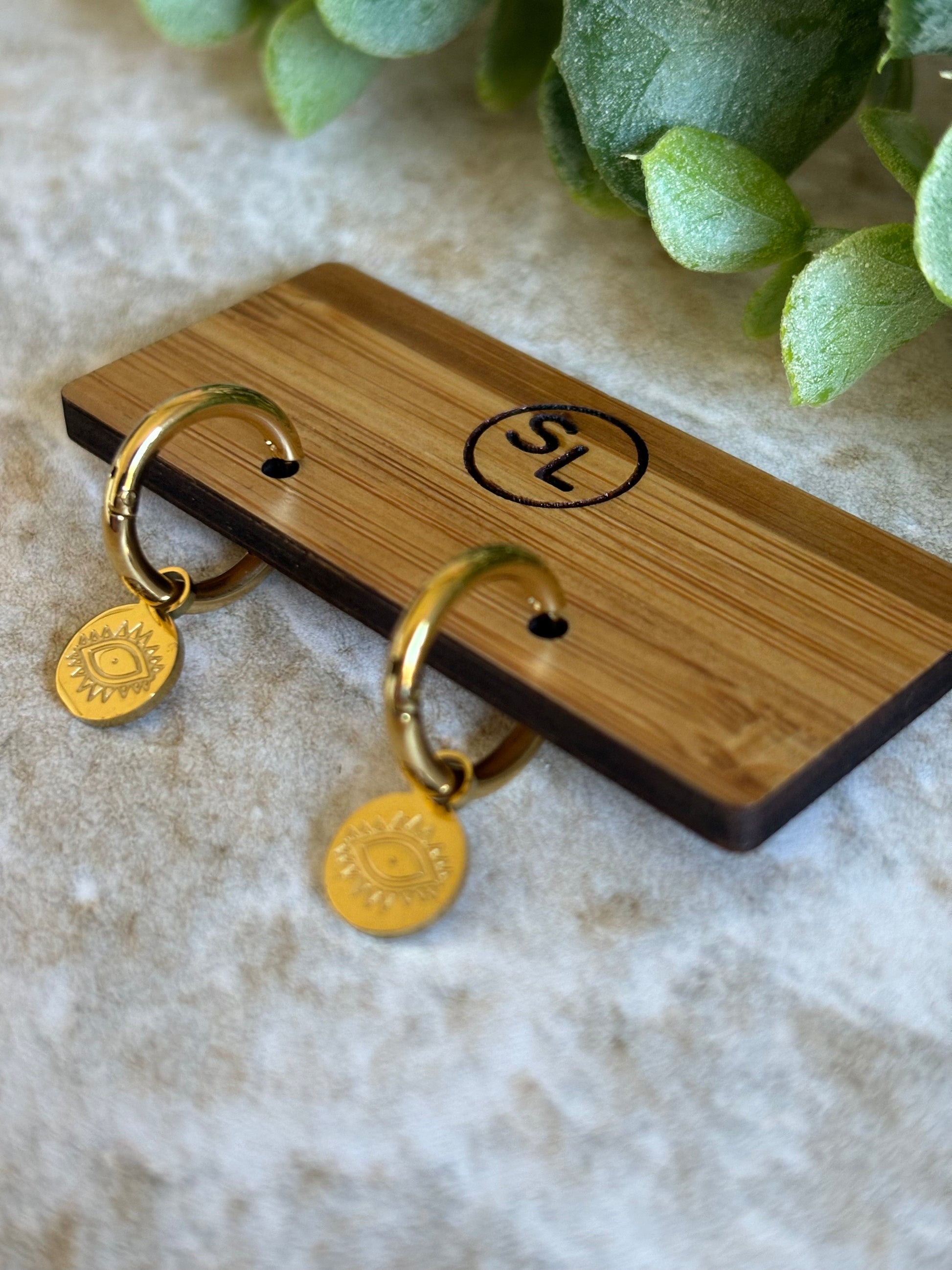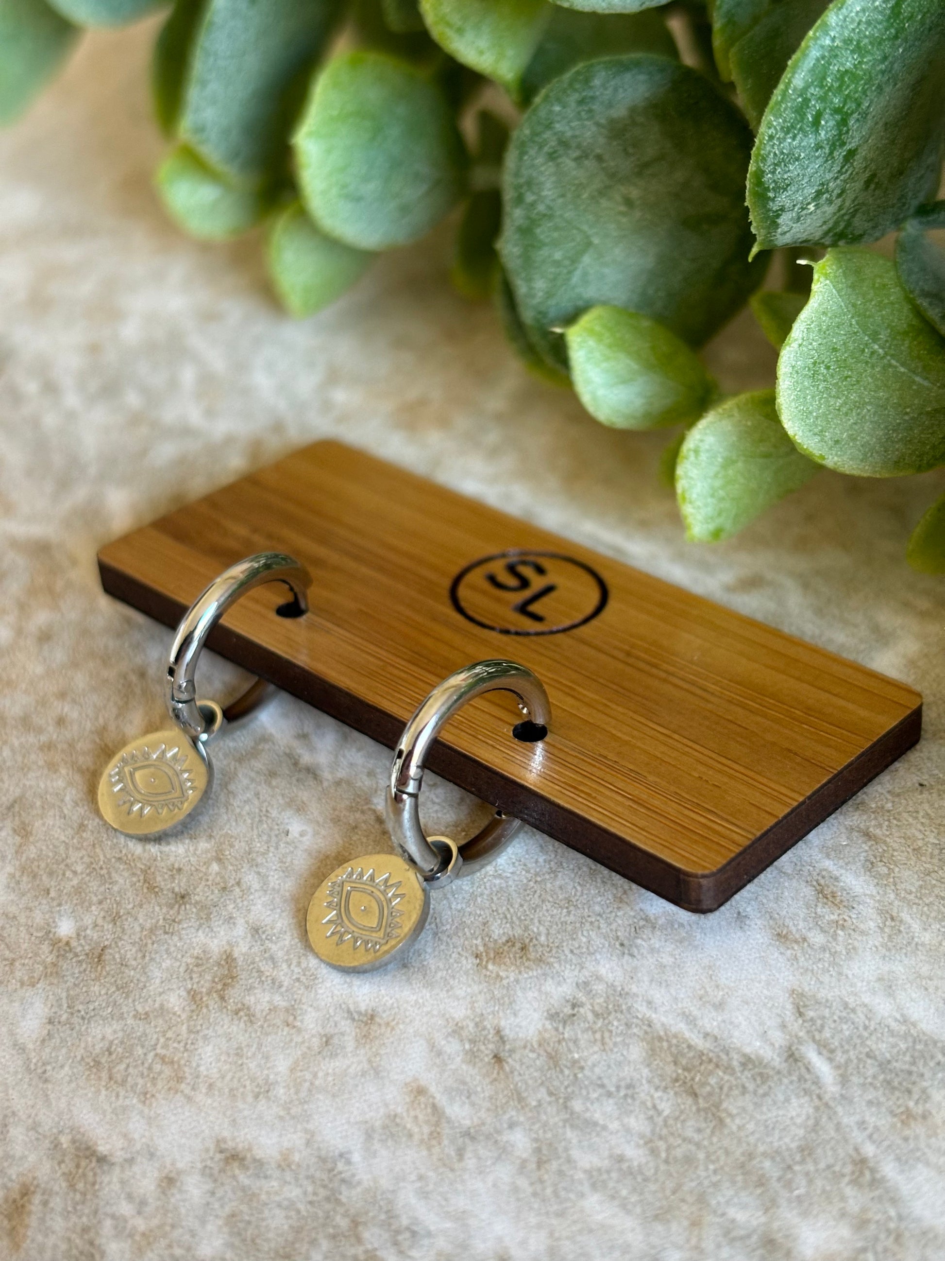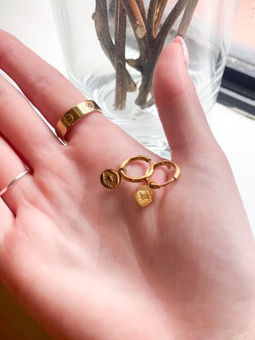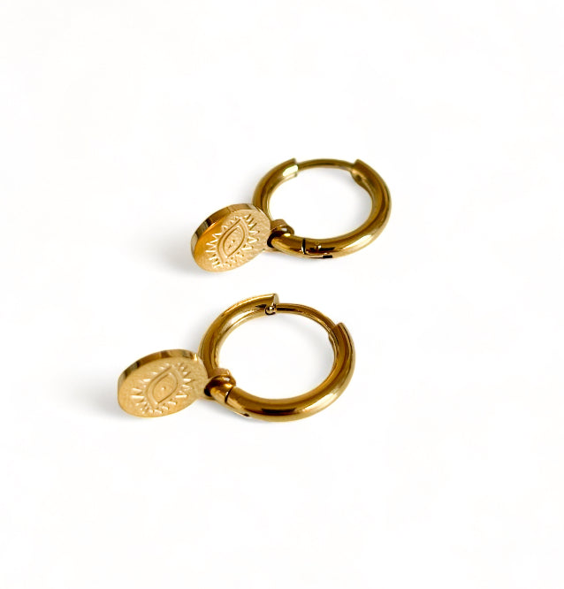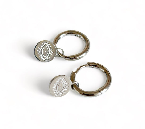 Introducing "Egypt Eye" earrings: Embodying the mystique and allure of ancient Egypt, these stainless steel huggie hoop style earrings come in both 14k gold plated and silver finishes. Featuring a captivating round disc with intricate eye detail drop, they exude an aura of intrigue and sophistication. With an earring height of 2cm and an eardrop width of 0.8cm, they offer a subtle yet captivating look. Named after the iconic symbol of protection, "Egypt Eye" earrings are also waterproof, making them perfect for everyday wear. Channel the timeless elegance of ancient Egypt with "Egypt Eye" earrings, seamlessly blending style with durability for the modern woman.
