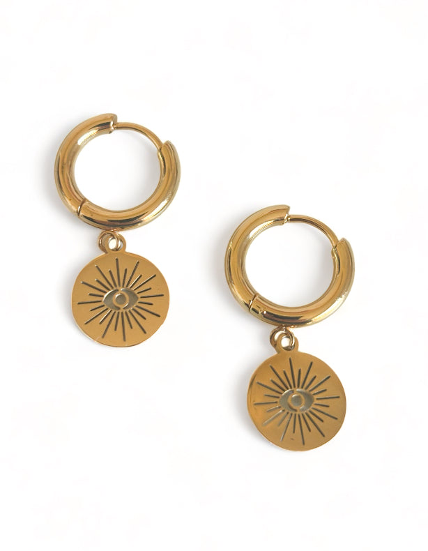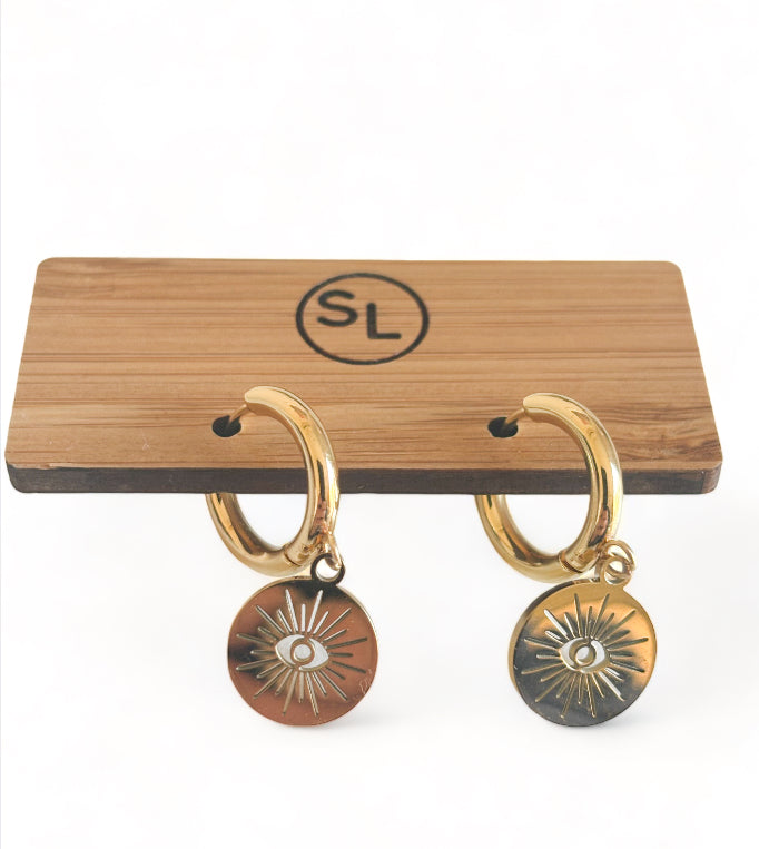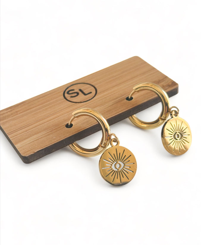 Introducing "Evil Eye" from our Luxe Collection: Embrace timeless elegance and protection with these captivating earrings, available exclusively in 18k gold plated stainless steel. A popular choice among our discerning customers, "Evil Eye" exudes sophistication and charm. With an eardrop height of 2.4 cm and a width of 1.2 cm, these earrings make a subtle yet powerful statement. Symbolizing protection, "Evil Eye" serves as a guardian against negativity and harm. Luxurious enough for special occasions, yet waterproof for everyday wear, "Evil Eye" is the perfect accessory for adding both style and security to any ensemble. Elevate your look with the enchanting allure of "Evil Eye" from our Luxe Collection.