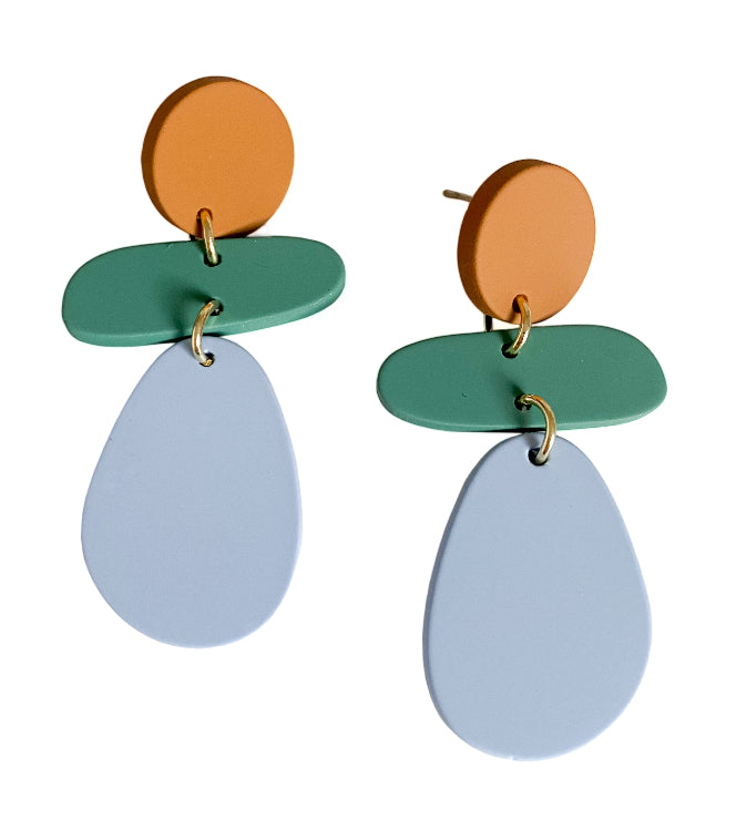 Introducing "Foxy Triples" earrings: Make a stylish statement with these eye-catching dangle earrings. Named for their foxy charm, they feature stainless steel ear posts for durability and comfort. With a unique design, these earrings boast a brown stud top complemented by a jade horizontal feature and hand-sculptured sky blue teardrop, adding an element of sophistication and whimsy. Made from acrylic, they measure 5 cm in length and have a maximum width of 2.5 cm, making them the perfect accessory to elevate any ensemble. Embrace your foxy side with "Foxy Triples" earrings and let your style shine.