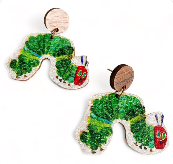 Introducing "Hungry Caterpillar Dangles" Inspired by the beloved children's storybook, they feature stainless steel ear posts for durability and comfort. Crafted from wood, these earrings boast a playful caterpillar design that's sure to delight. Perfect for teachers or anyone who loves to tell the good story, they measure 4.5 cm in length and have a maximum width of 4.3 cm. Add a dose of nostalgia to your look with "Hungry Caterpillar Dangles" earrings and let your inner child shine.
