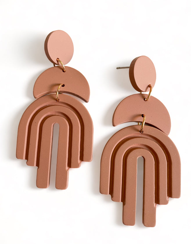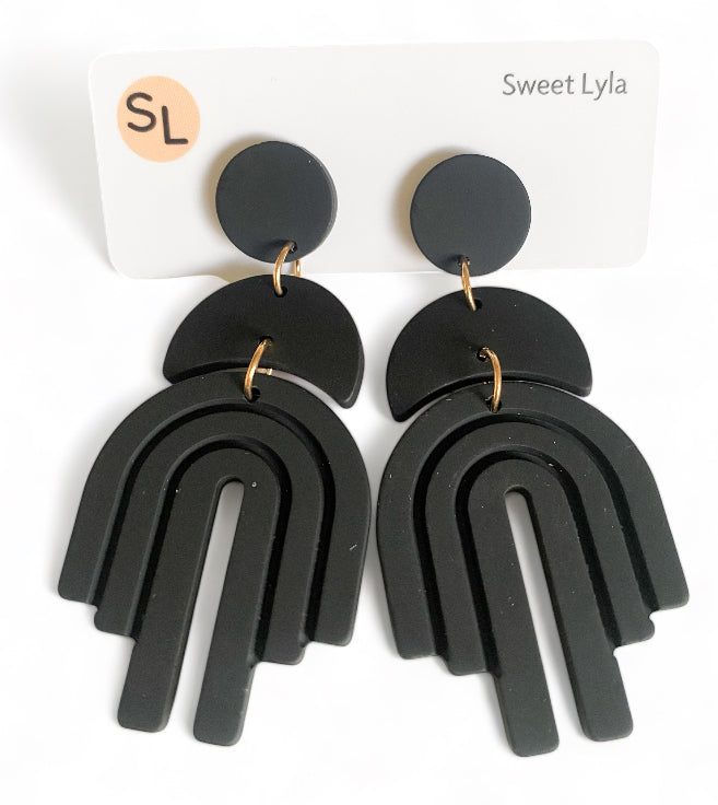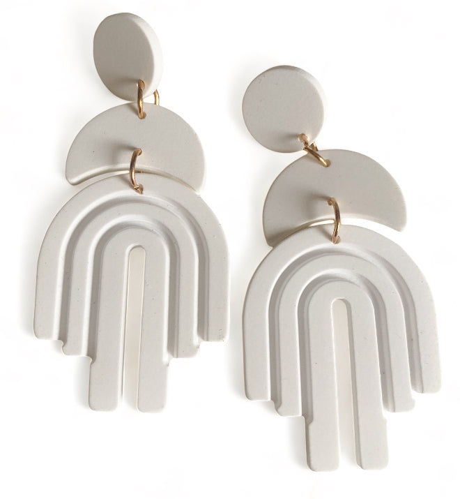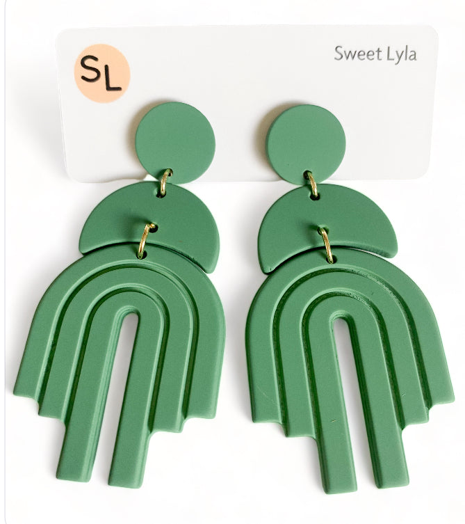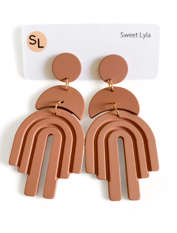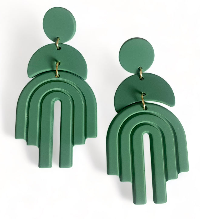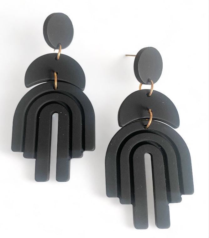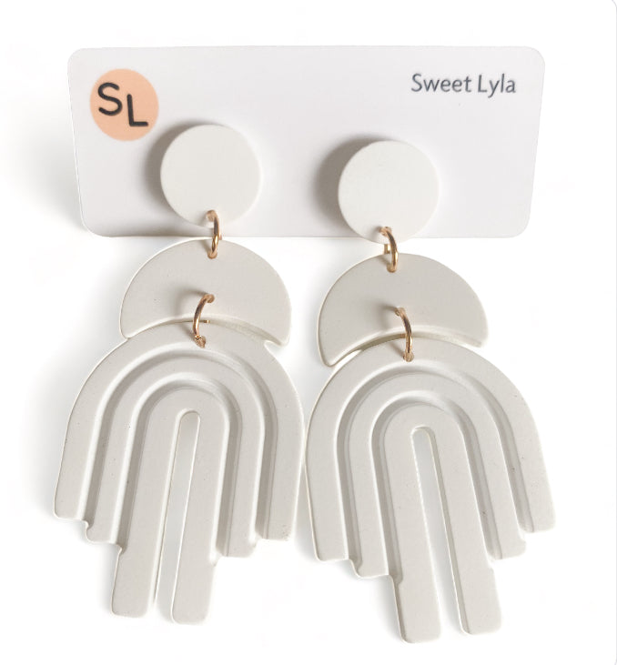 Introducing "Lexi Rainbow Dangles" earrings: Add a burst of color to your ensemble with these playful and vibrant dangle earrings. Named for their charming arched rainbow design, they feature stainless steel ear posts for durability and comfort. Made from acrylic, these earrings boast solid colour dangles with a delightful rainbow accent. Available in Tan, Black, White, and Green, you can choose the perfect pair to suit your style. With a length of 6.8 cm and a maximum width of 3.2 cm, they offer a bold yet wearable accessory option. Make a statement with "Lexi Rainbow Dangles" earrings and let your personality shine.