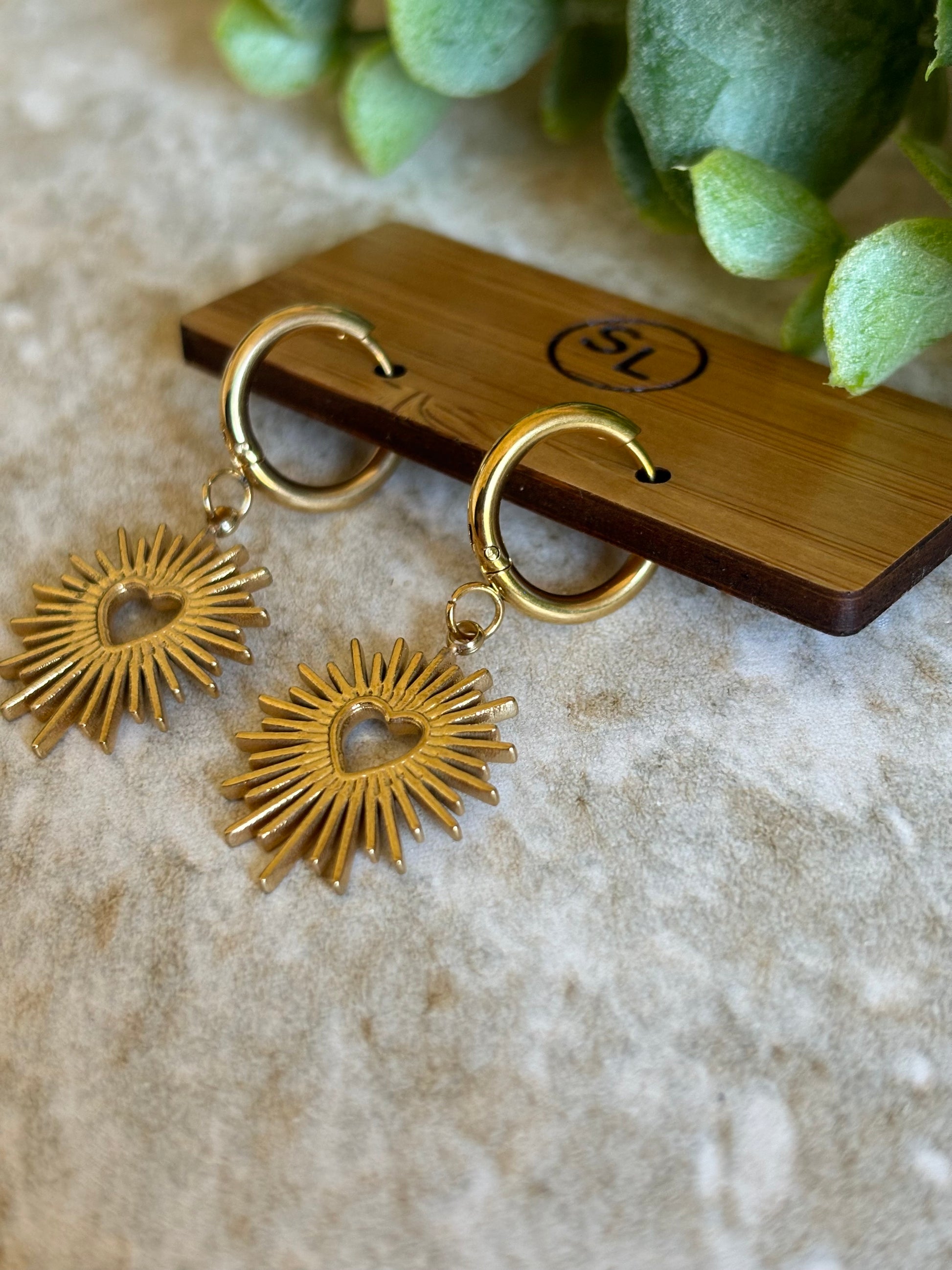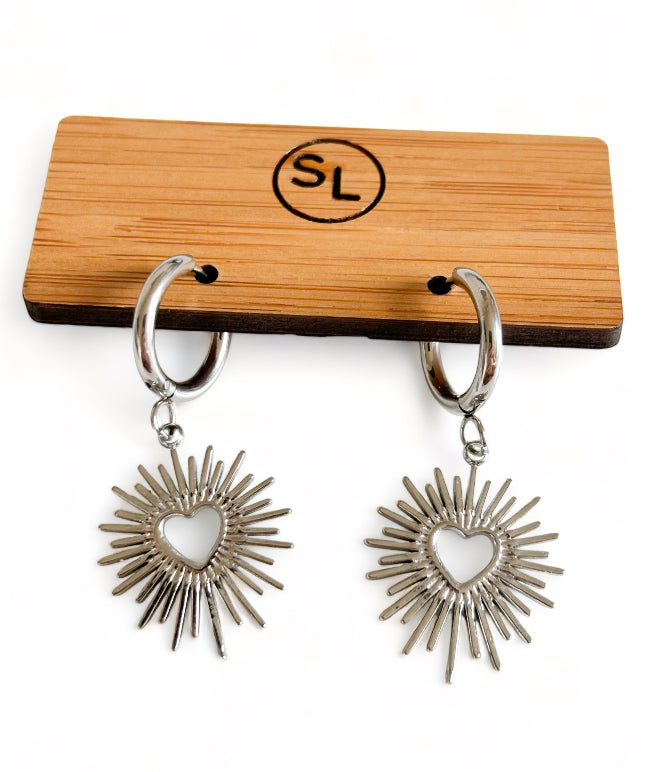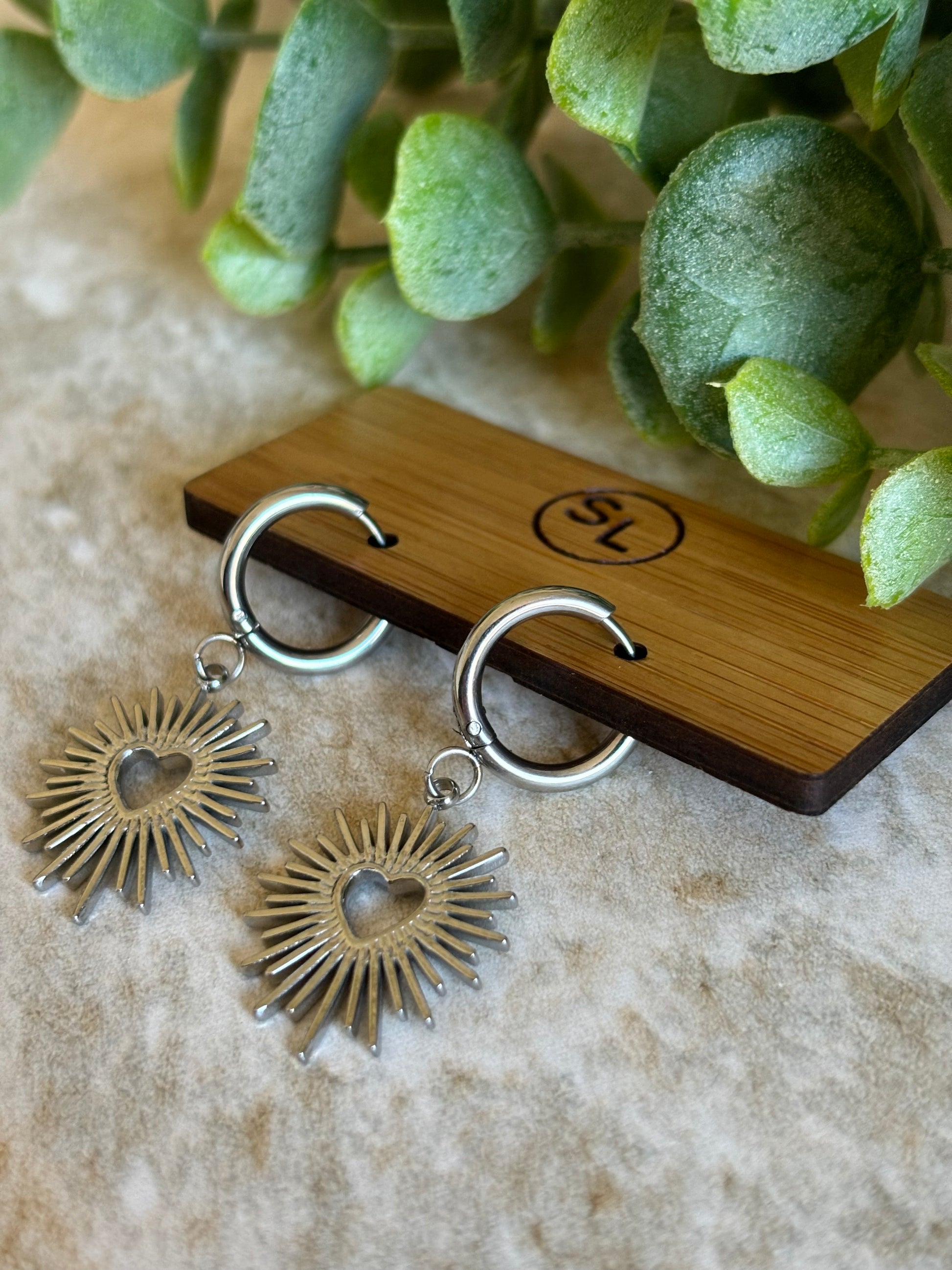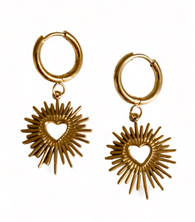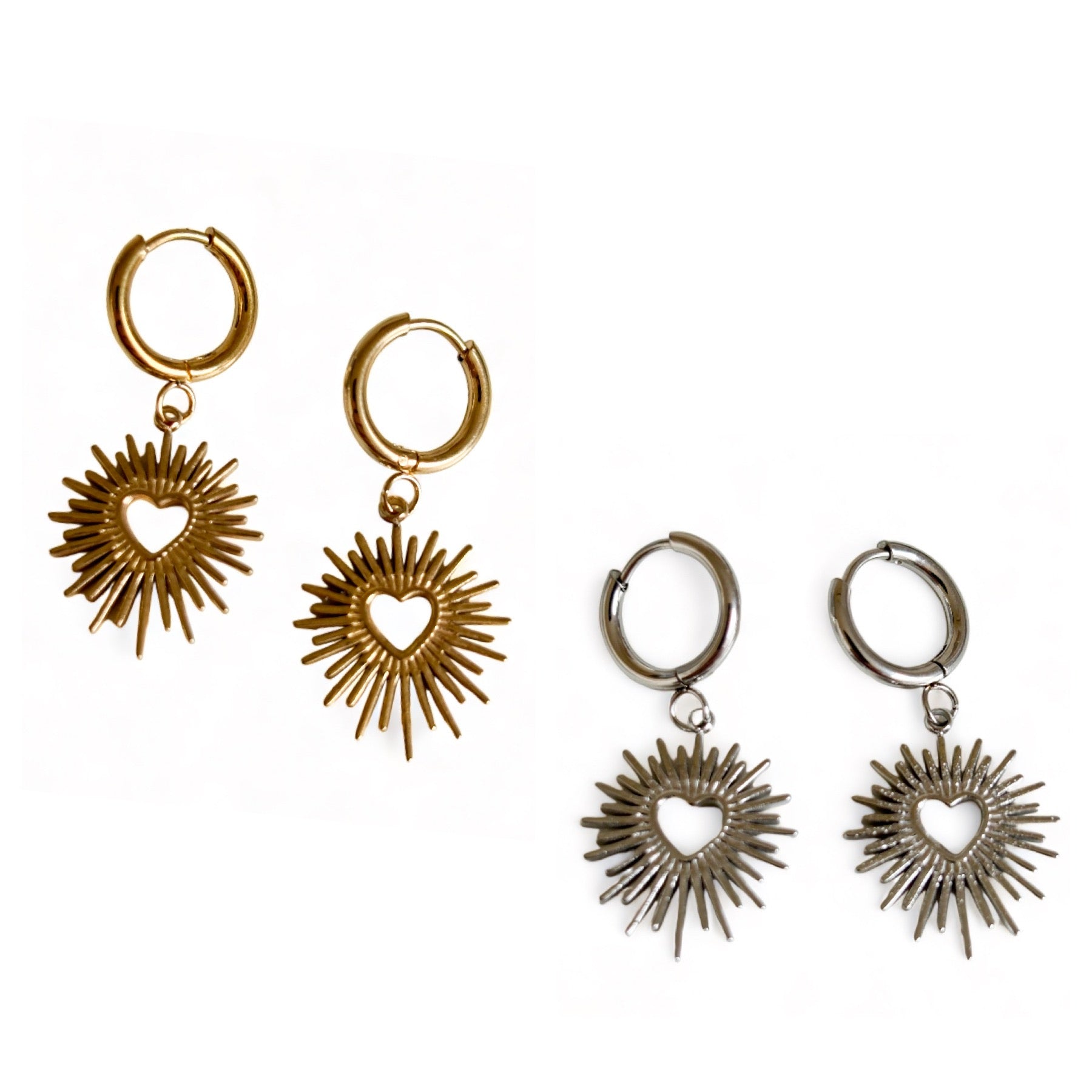Introducing "Love Struck" earrings: Radiating with celestial charm, these stainless steel huggie hoop style earrings are available in both 14k gold plated and silver finishes. Featuring a whimsical heart bursting star drop design, they evoke feelings of love and wonder. With an earring height of 2cm and an eardrop width of 1.4cm, they offer a delicate yet captivating look. Named "Love Struck" for their enchanting appeal, these earrings are also waterproof, making them ideal for everyday wear. Embrace the magic of love and style with "Love Struck" earrings, effortlessly blending celestial beauty with everyday elegance.