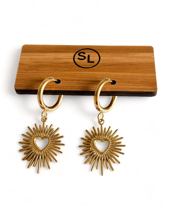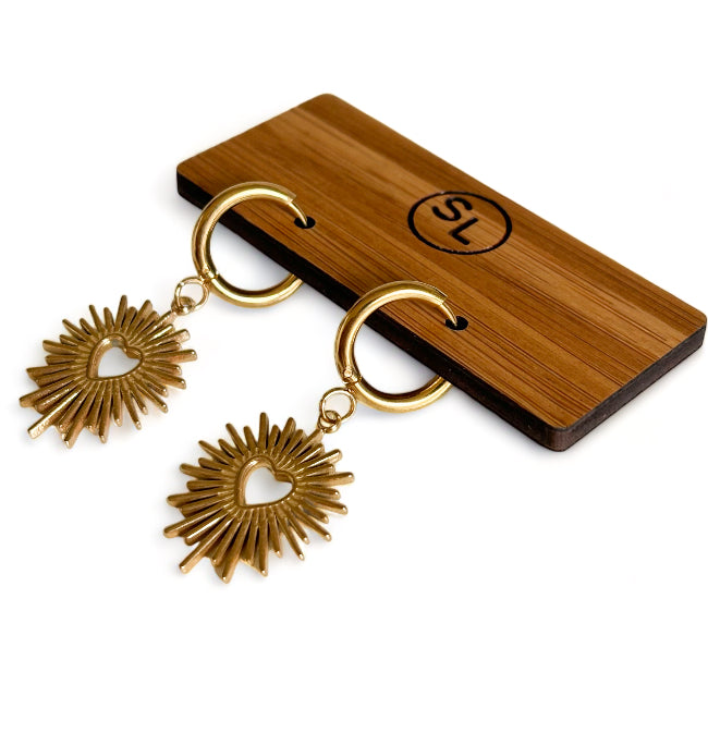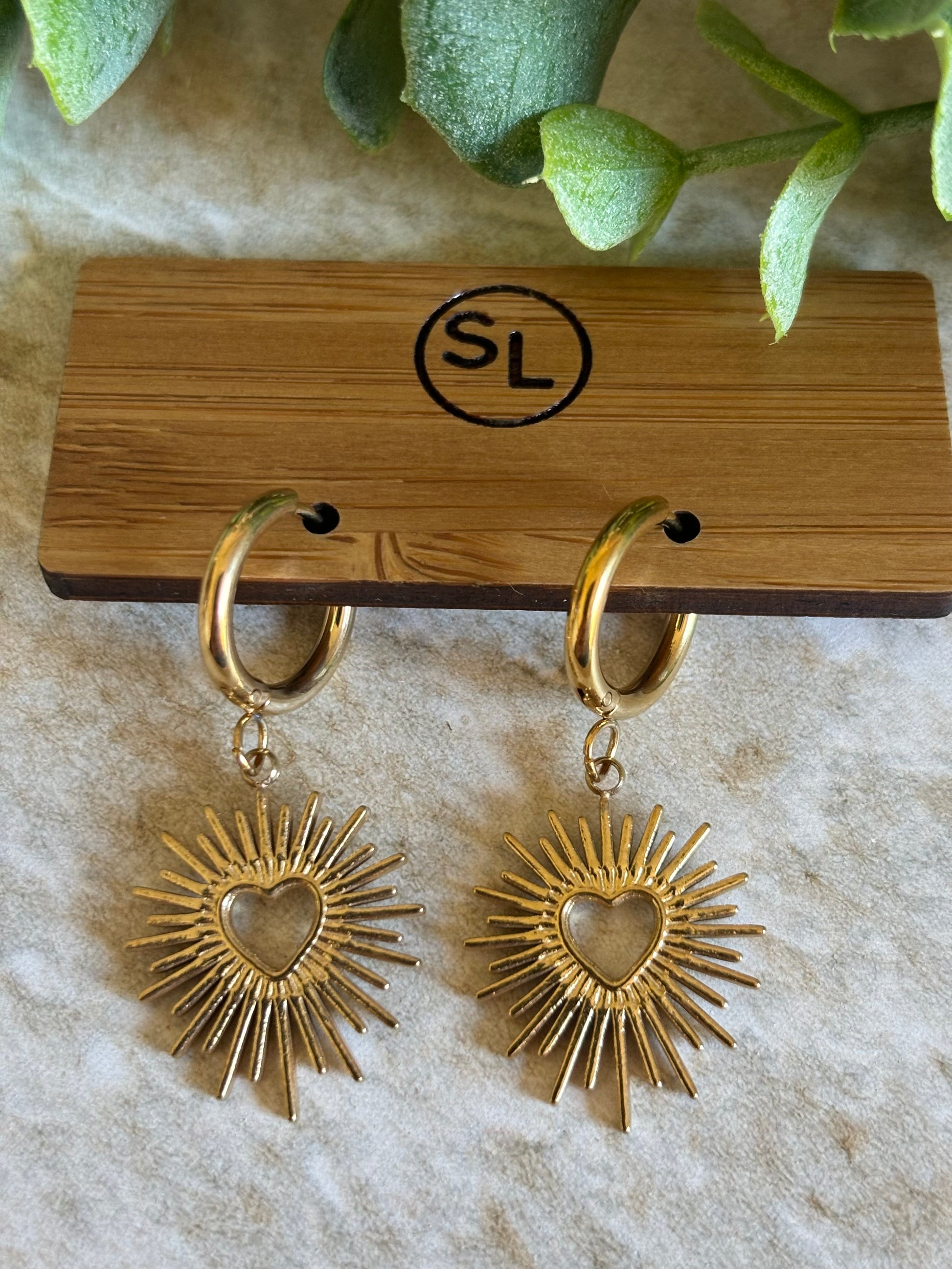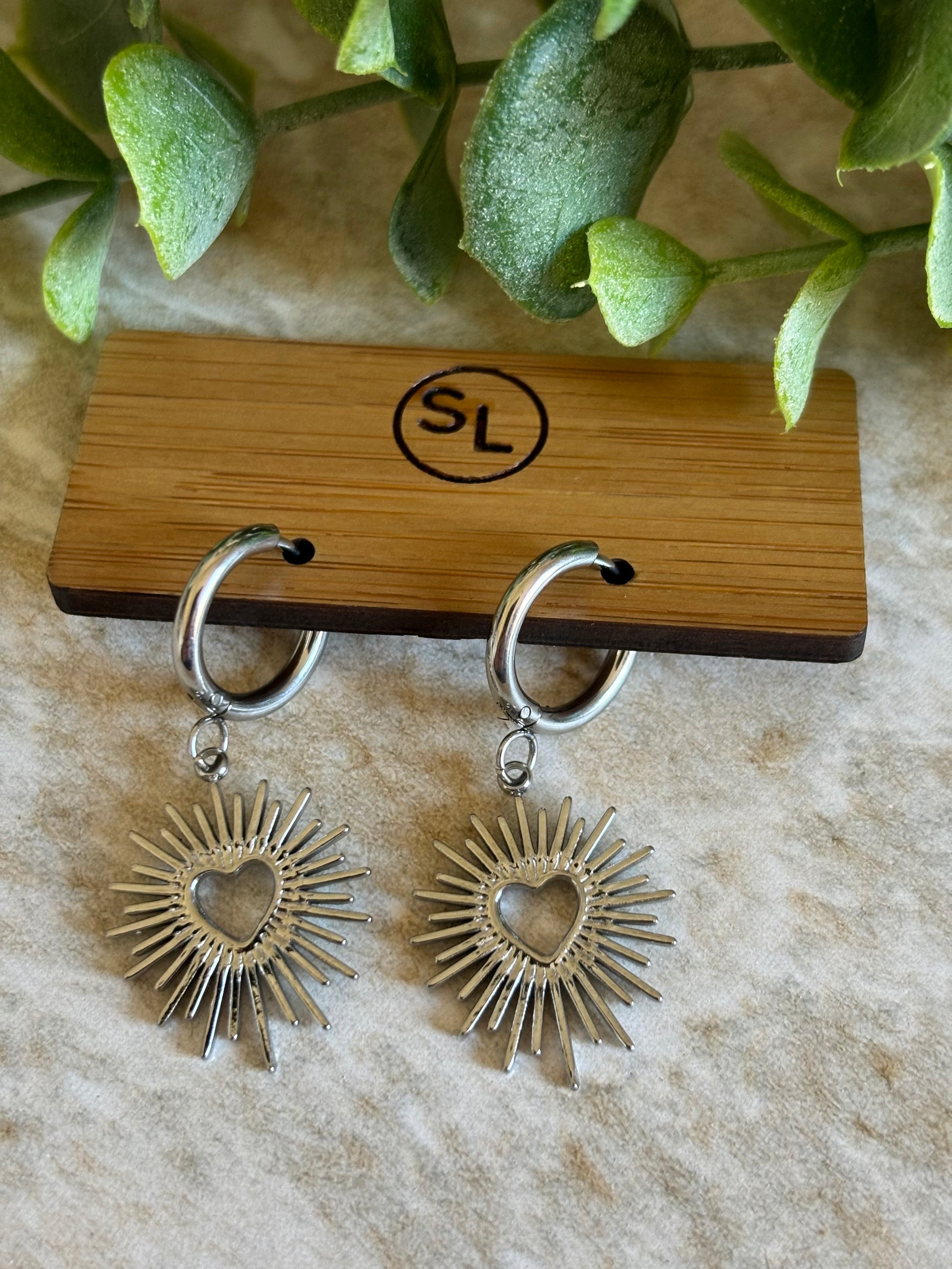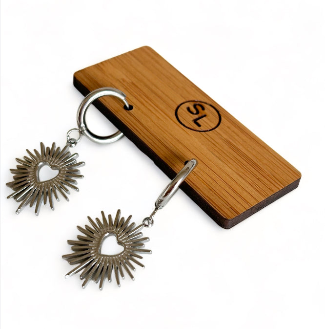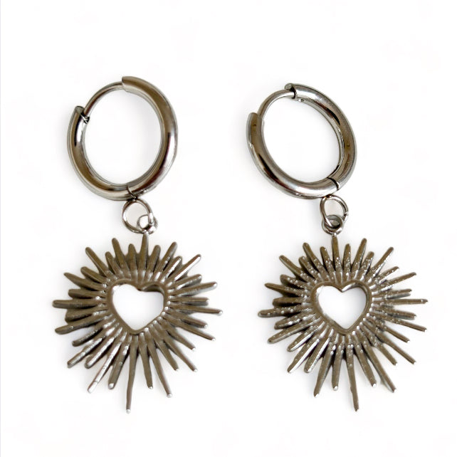 Introducing "Love Struck" earrings: Radiating with celestial charm, these stainless steel huggie hoop style earrings are available in both 14k gold plated and silver finishes. Featuring a whimsical heart bursting star drop design, they evoke feelings of love and wonder. With an earring height of 2cm and an eardrop width of 1.4cm, they offer a delicate yet captivating look. Named "Love Struck" for their enchanting appeal, these earrings are also waterproof, making them ideal for everyday wear. Embrace the magic of love and style with "Love Struck" earrings, effortlessly blending celestial beauty with everyday elegance.