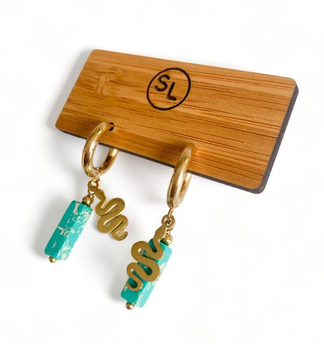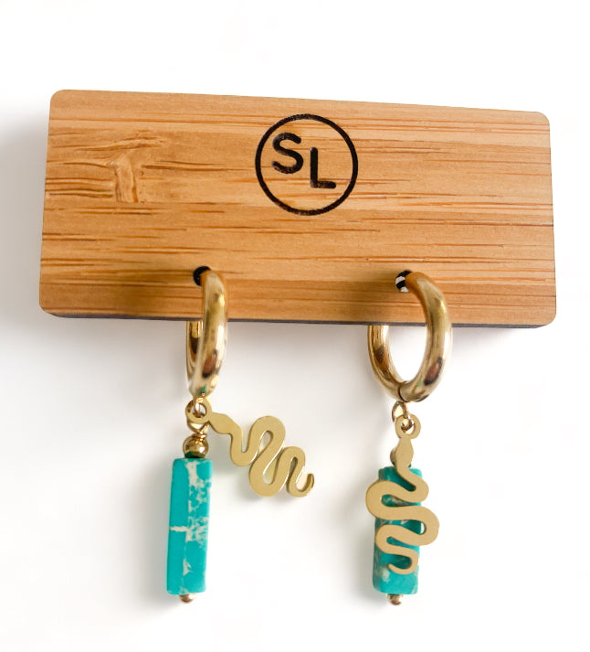 Introducing "Reputation" from our Luxe Collection: Make a statement with these exquisite earrings, available exclusively in 18k gold plated stainless steel. Named after pop star Taylor Swift's iconic album, "Reputation" exudes confidence and sophistication. Featuring an aqua long square pendant adorned with a gold snake detail, these earrings are sure to turn heads and spark conversation. With an approximate eardrop height of 3cm and a width of 1.2cm, each detail is unique, ensuring that no two earrings are exactly alike. Waterproof for everyday wear, "Reputation" earrings allow you to showcase your style with confidence, just like Taylor Swift herself. Elevate your look and embrace your inner superstar with "Reputation" from our Luxe Collection.