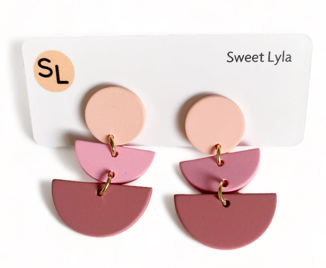 Introducing "Mini Triples" earrings: Add a playful touch to your ensemble with these charming dangle earrings. Named for their delightful triple design, they feature stainless steel ear posts for durability and comfort. Made from acrylic, these earrings boast three shades of pink, creating a fun and vibrant look. With a length of 3.8 cm and a maximum width of 2.5 cm, they offer a subtle yet eye-catching accessory option. Whether you're dressing up for a night out or adding a pop of color to your everyday look, "Mini Triples" earrings are sure to become a favorite in your jewelry collection.