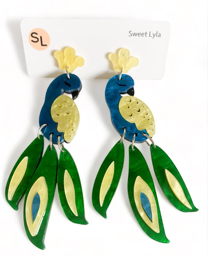 Introducing "Peacock" dangle earrings: Make a bold and majestic statement with these exquisite earrings. Named for their striking resemblance to the vibrant feathers of a peacock, they feature stainless steel ear posts for durability and comfort. Crafted with meticulous attention to detail, these earrings are a true work of art, made with many layers of acrylic to create a spectacular and dimensional look. With a length of 8.5 cm and a maximum width of 2 cm, they are sure to capture attention and add a touch of elegance to any outfit. Embrace your inner beauty and confidence with "Peacock" dangle earrings and let your style soar.