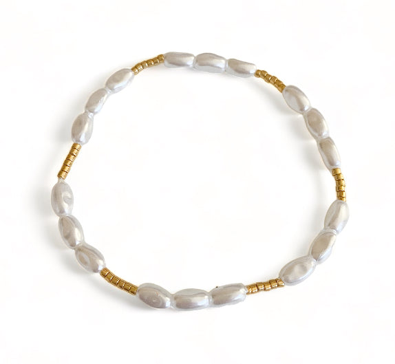 Introducing the Pearl Beaded Bracelet from the SL Luxe Collection: Elevate your wrist with this elegant and sophisticated piece, designed to add a touch of luxury to any ensemble. This bracelet features clusters of cultured faux pearls, accented by gleaming gold beads delicately interspersed between every trio of pearls. Crafted with an elastic stretch, it offers ease of wear and a comfortable fit. measuring 6cm in diameter Without stretching Delicate in appearance yet waterproof for everyday wear, this bracelet seamlessly combines style and durability. A favorite among teens, it adds a chic and timeless flair to any outfit. Embrace the sophistication of the SL Luxe Collection with the Pearl Beaded Bracelet and elevate your accessory game with effortless elegance.
