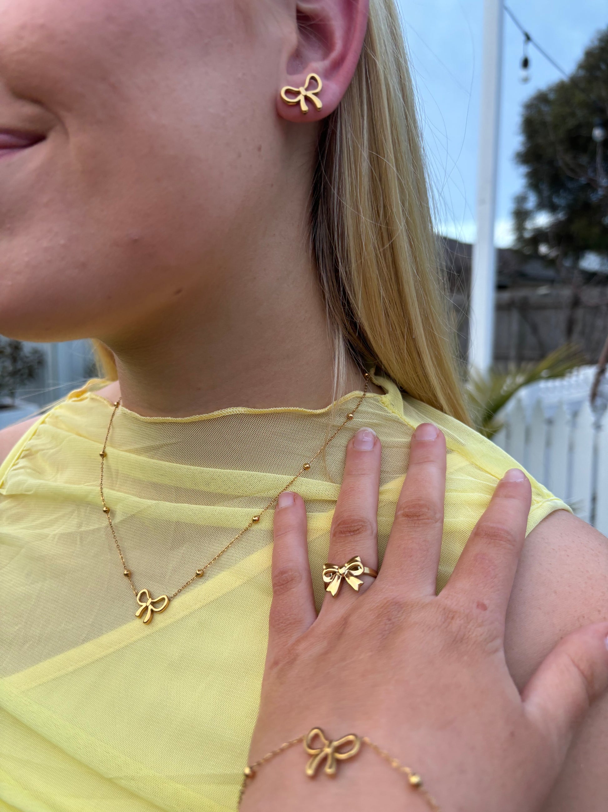 Discover timeless elegance with the Petite Bow Ring from our SL Luxe Collection. Crafted from high-quality 18k gold-plated stainless steel, this piece offers durability and lasting shine, perfect for everyday wear. Its delicate bow design, measuring approximately 1.1cm x 1.5cm, adds a charming touch of sophistication. With an adjustable size, it ensures a comfortable fit for many. Pair this ring with our matching bow necklace and bracelet for a beautifully coordinated look. Elevate your jewelry collection with this affordable yet luxurious accessory.