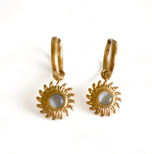 Introducing "Petra Sun" from our Luxe Collection: Inspired by European sophistication, "Petra Sun" captures the essence of timeless elegance with a touch of modern flair. Featuring a stunning sun motif with an inlaid slate grey center, these earrings exude sophistication and style. Available exclusively in 18k gold plated stainless steel, "Petra Sun" measures 2.6cm in length with a maximum width of 1.4cm, making them a statement accessory that adds a touch of glamour to any ensemble. Waterproof for everyday wear, these earrings offer both durability and elegance, ensuring you shine bright in any setting. Embrace the allure of European-inspired sophistication with "Petra Sun" from our Luxe Collection and elevate your look with celestial charm.