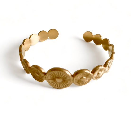 Introducing the Sunrise Boho Cuff Bangle from the SL Luxe Collection: Elevate your wrist with this stunning piece, available in both 18k gold plated steel and silver stainless steel options. With its bohemian-inspired design, this cuff-style bangle features an oval solid stainless steel construction adorned with intricate circles and sun details, evoking the beauty of a radiant sunrise. The adjustable measurements allow you to customize the fit to your liking, ensuring both comfort and style. Measuring approximately 7cm in inner length, it offers a sleek and substantial presence on the wrist. Waterproof for everyday wear, the Sunrise Boho Cuff Bangle seamlessly combines fashion and functionality, making it the perfect accessory for any occasion. Embrace the free-spirited elegance of the SL Luxe Collection with the Sunrise Boho Cuff Bangle and elevate your accessory game with timeless charm.