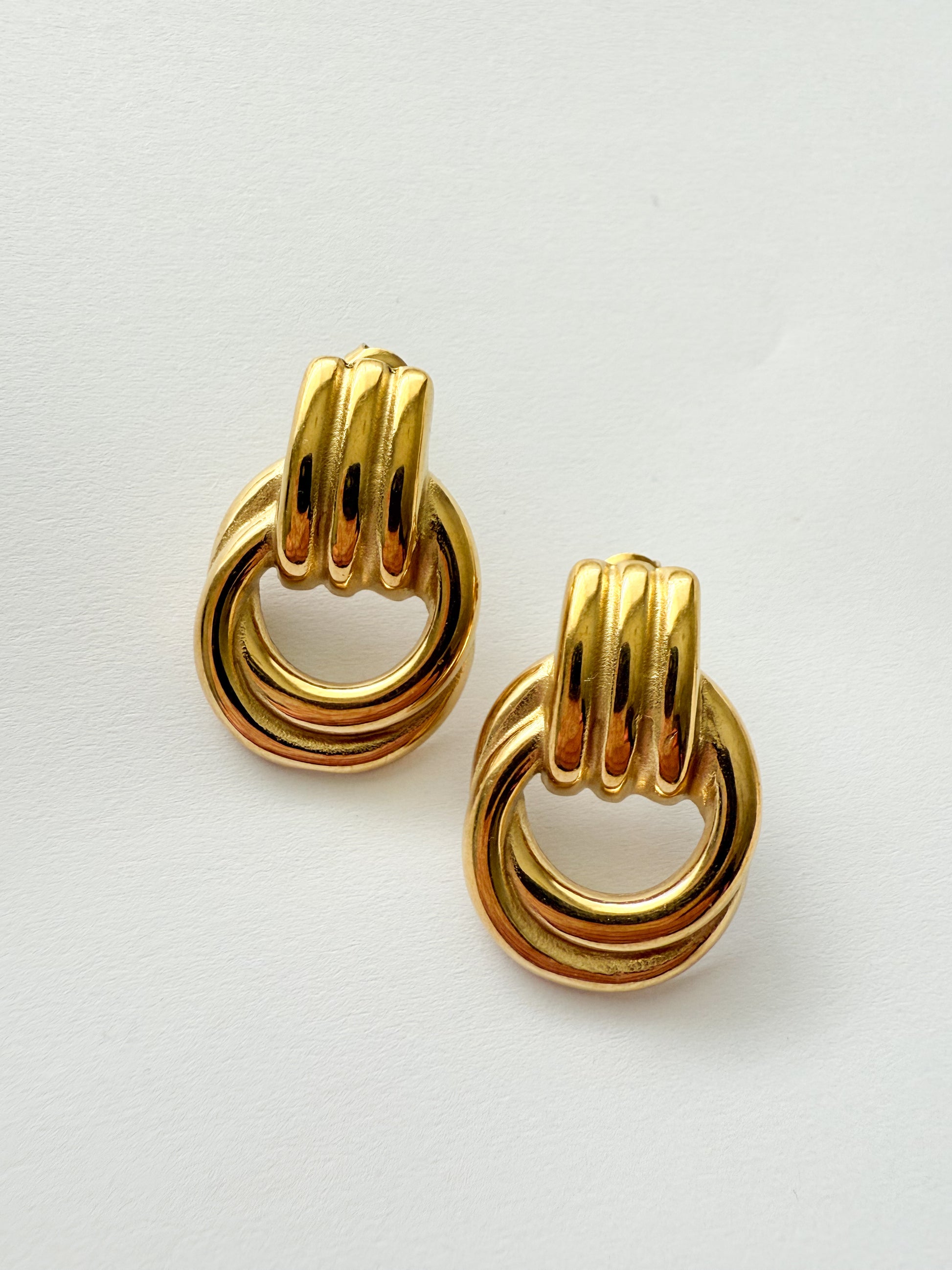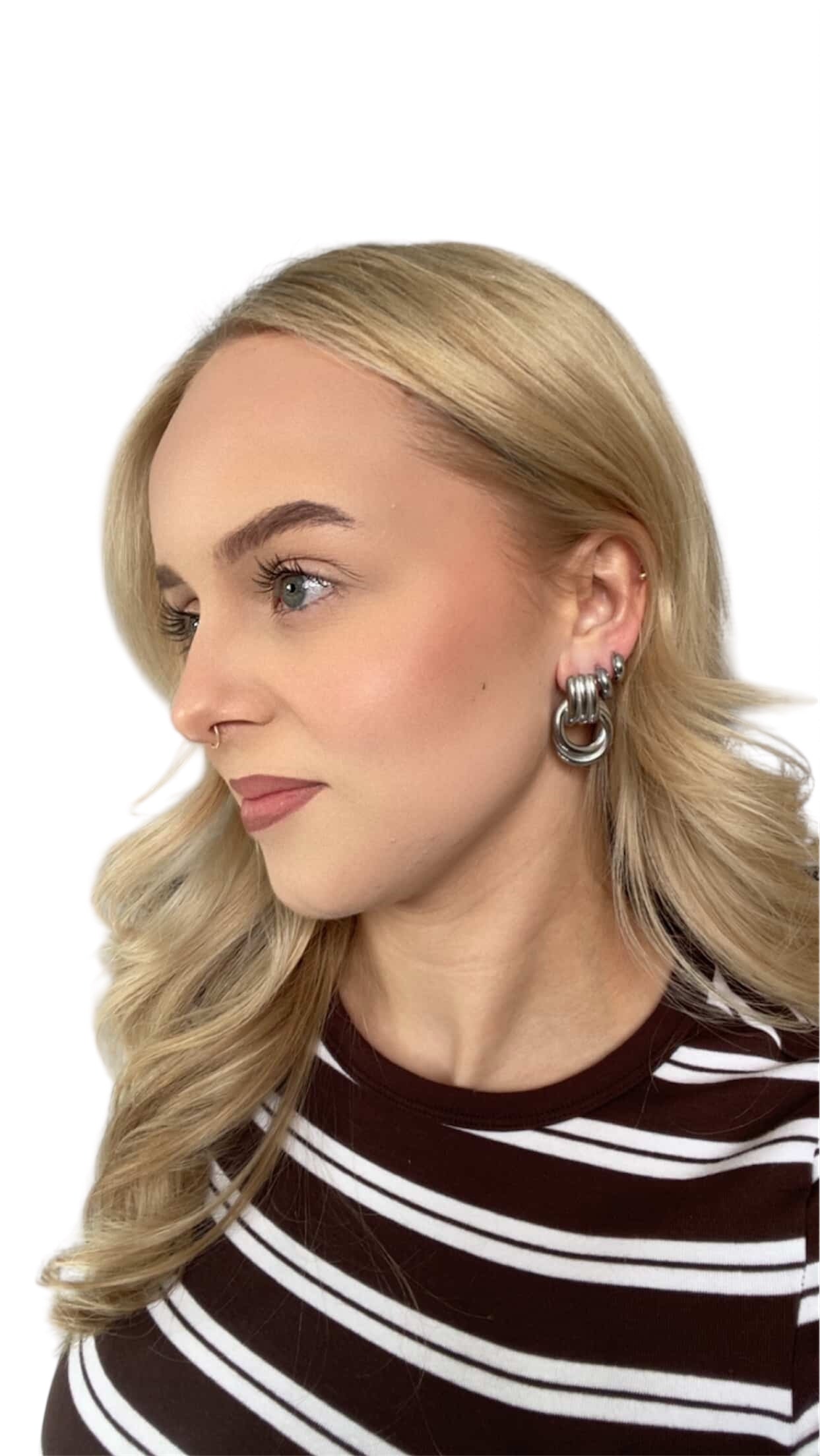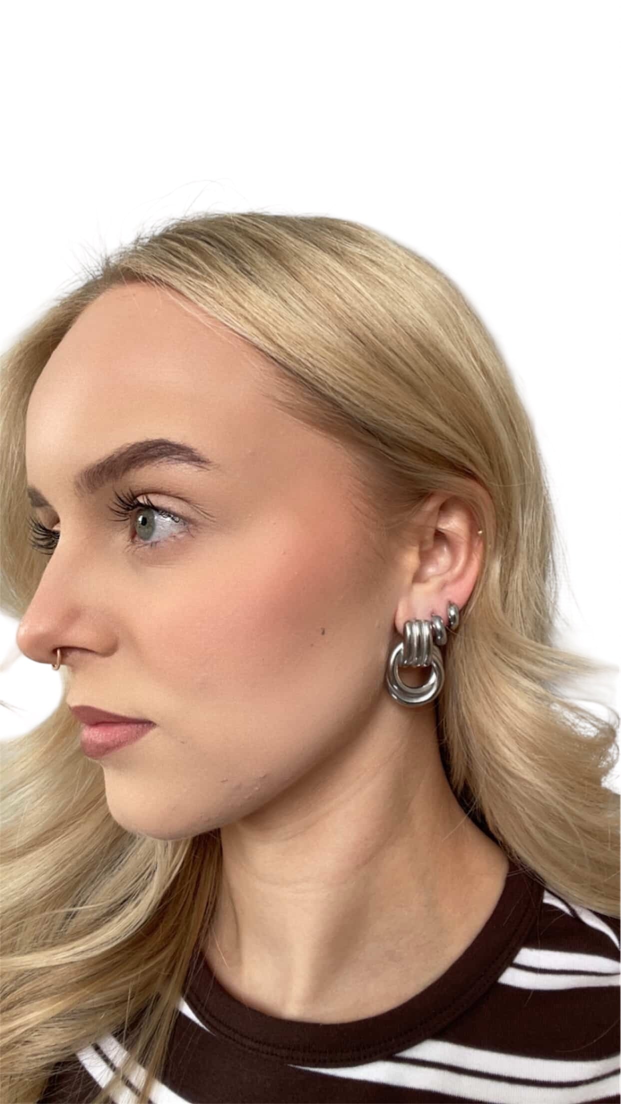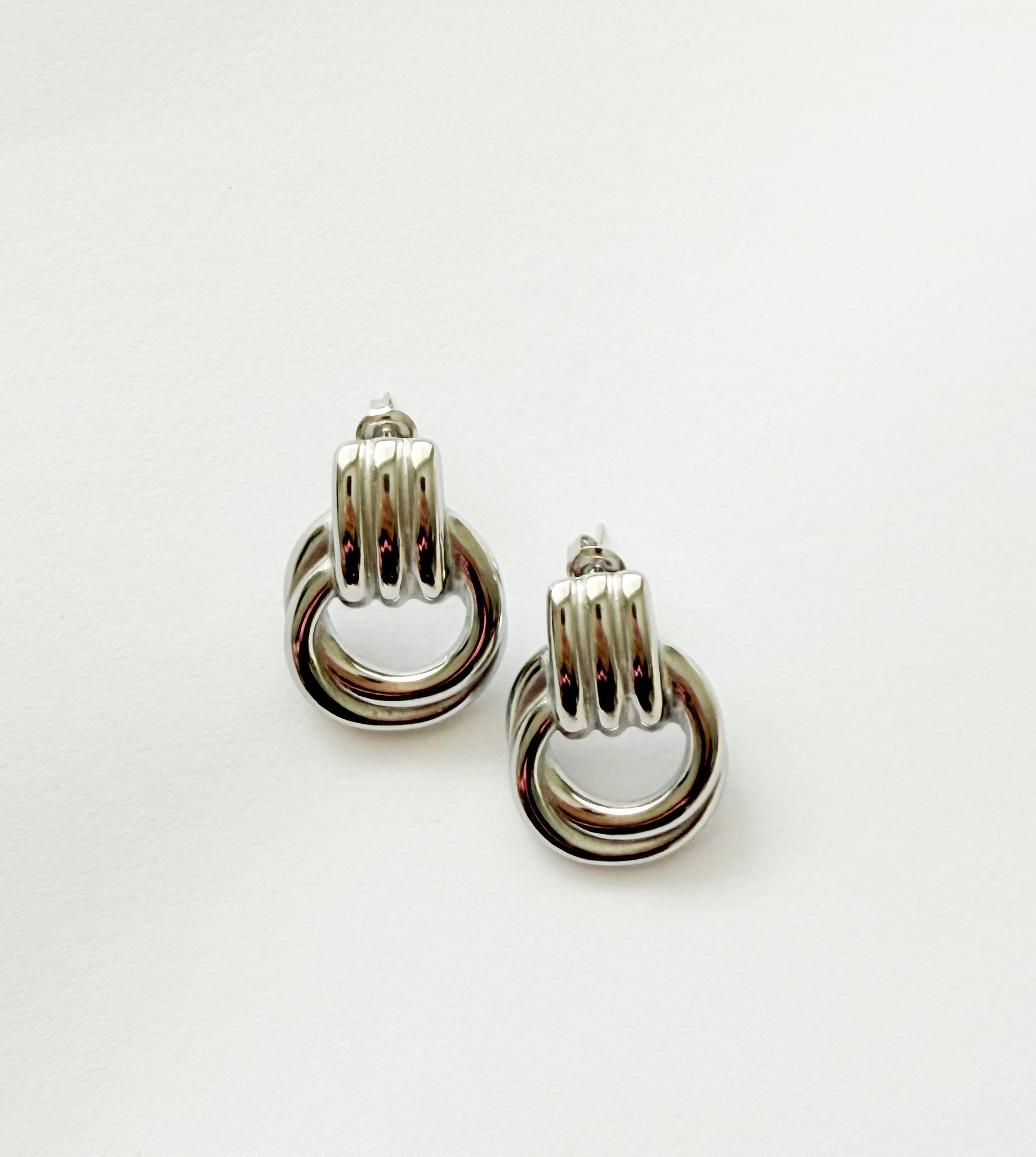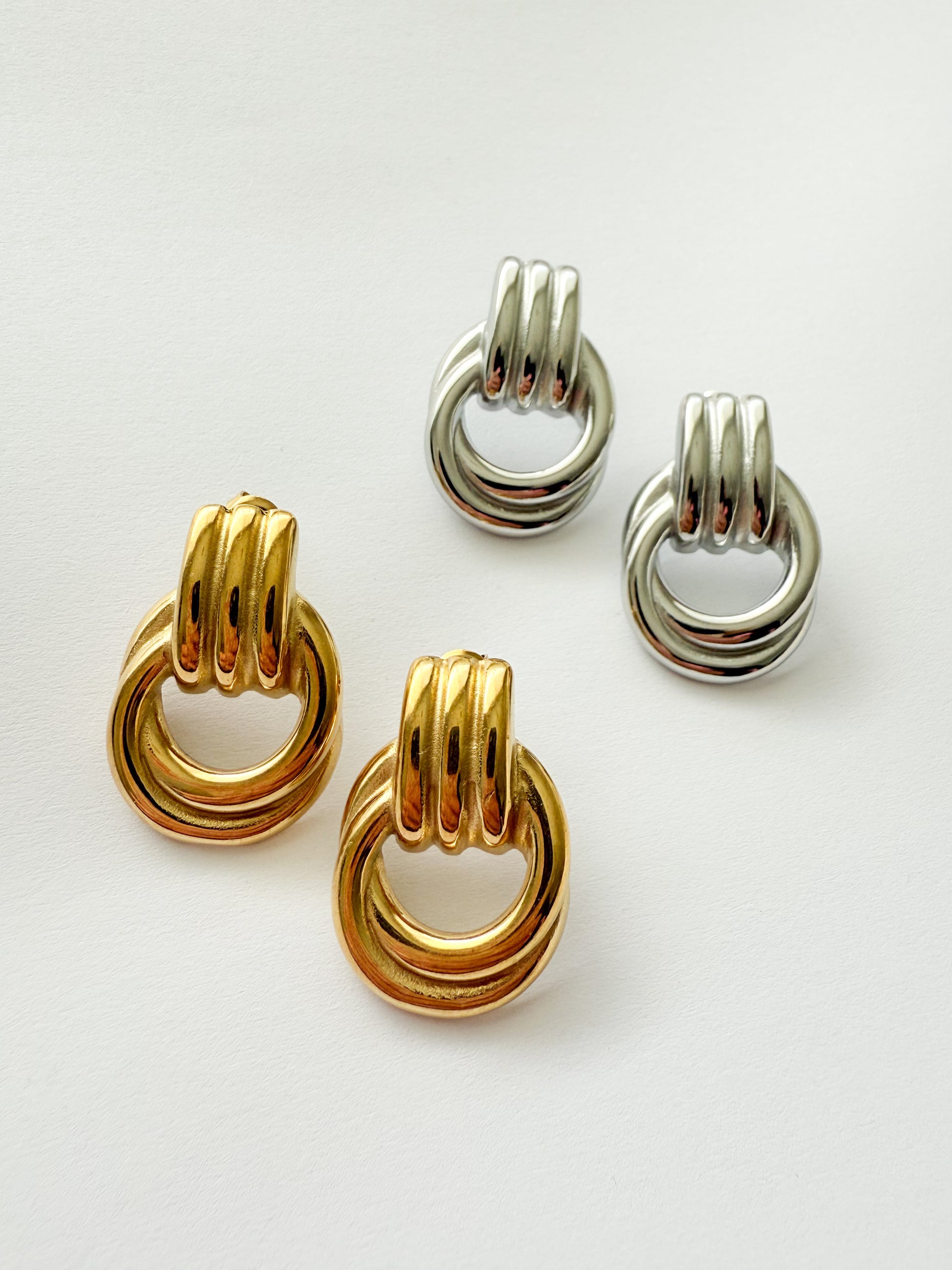 Bold yet balanced, these sculptural drop earrings measure 1.5cm wide and 3.5cm long, making a striking statement with elegant proportions. Three slender lines cascade gracefully into a swirling circular form—evoking movement and modernity. Crafted from stainless steel in a mix of silver and 18k gold plating, they bring an artful edge and luminous dual-tone finish to any look.
