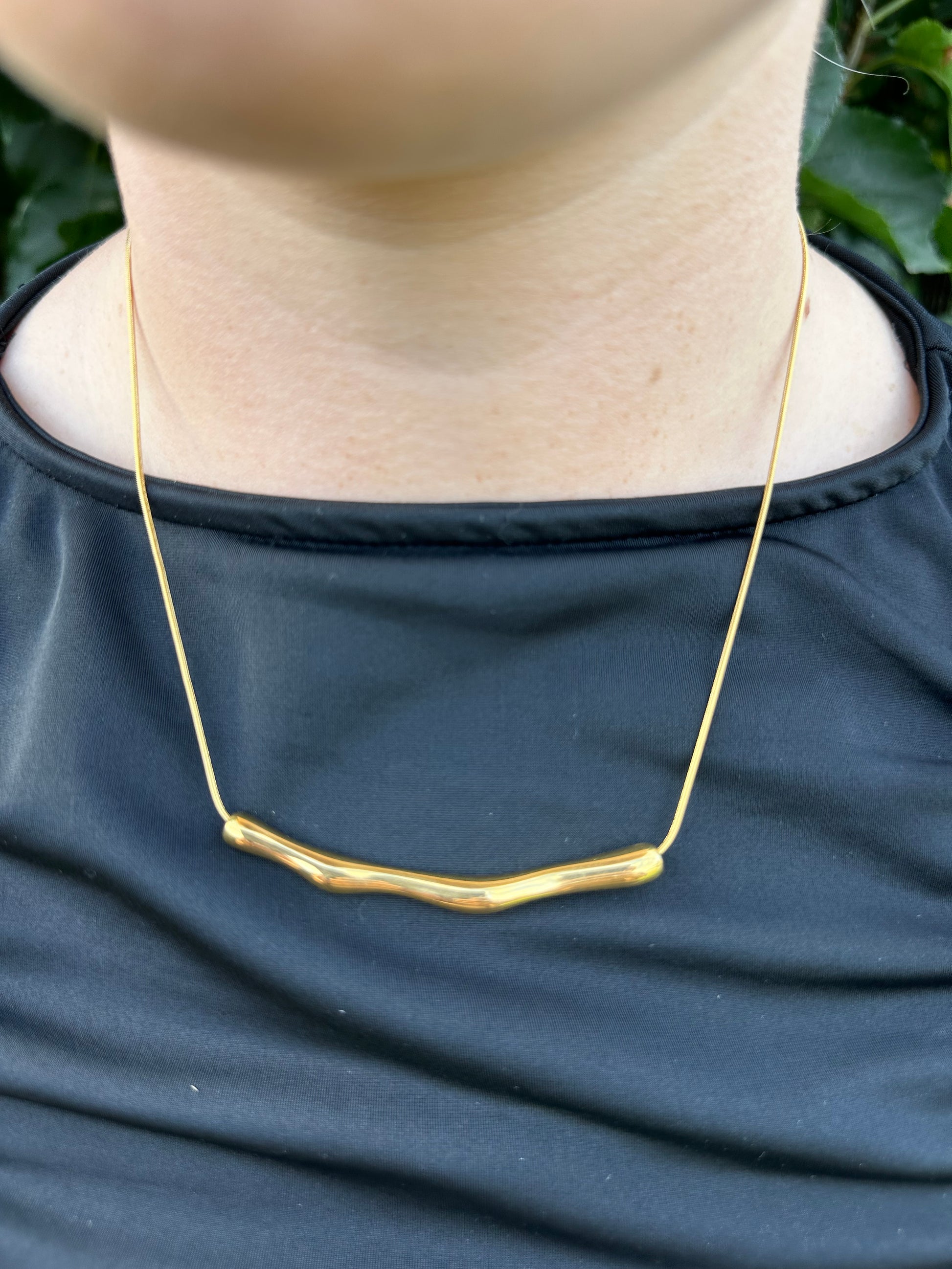 Elevate your everyday look with this minimalist bar necklace, featuring a smooth horizontal bar pendant with a slight, elegant wave that adds a unique touch of movement and sophistication. Crafted from durable stainless steel and available in both silver and 18k gold-plated finishes, this necklace is designed for lasting shine and style.