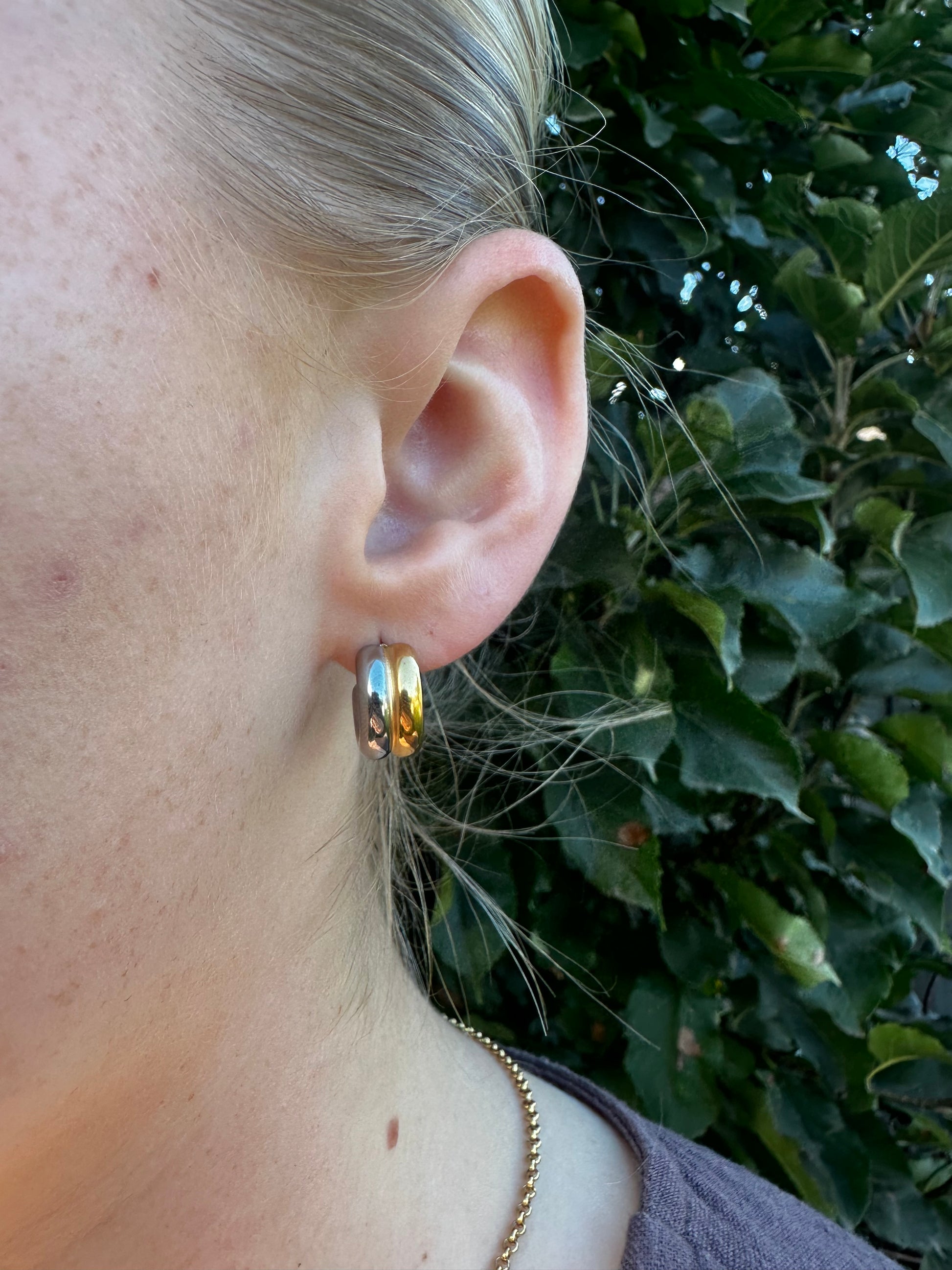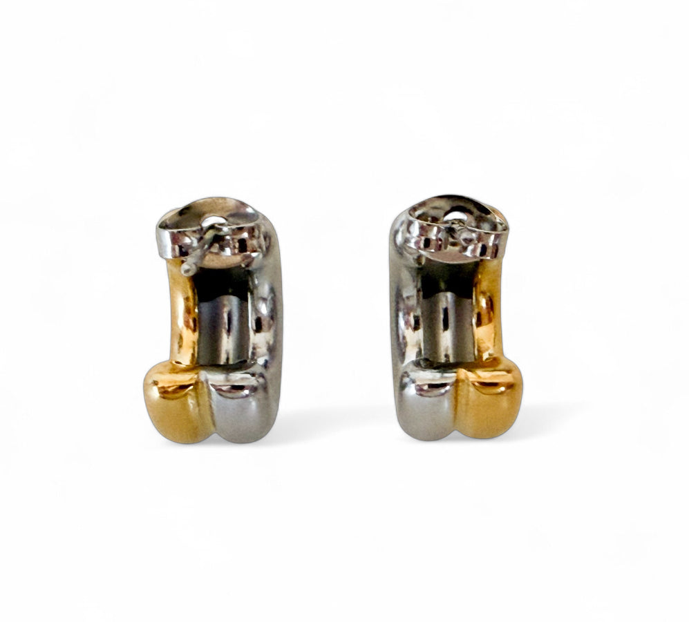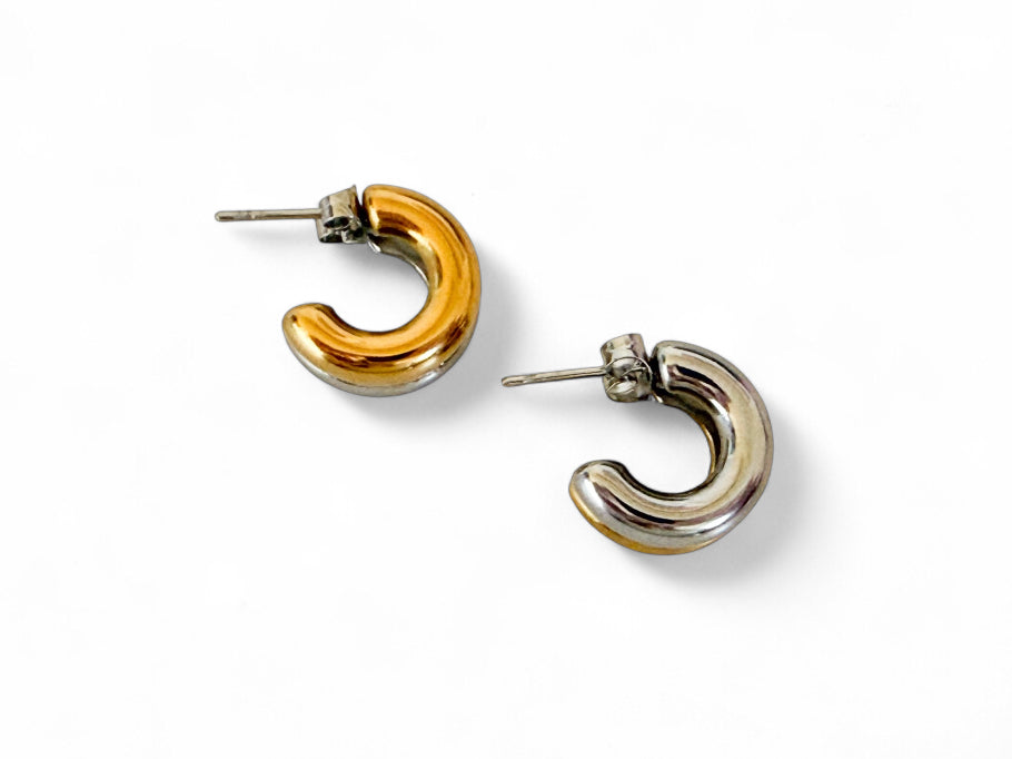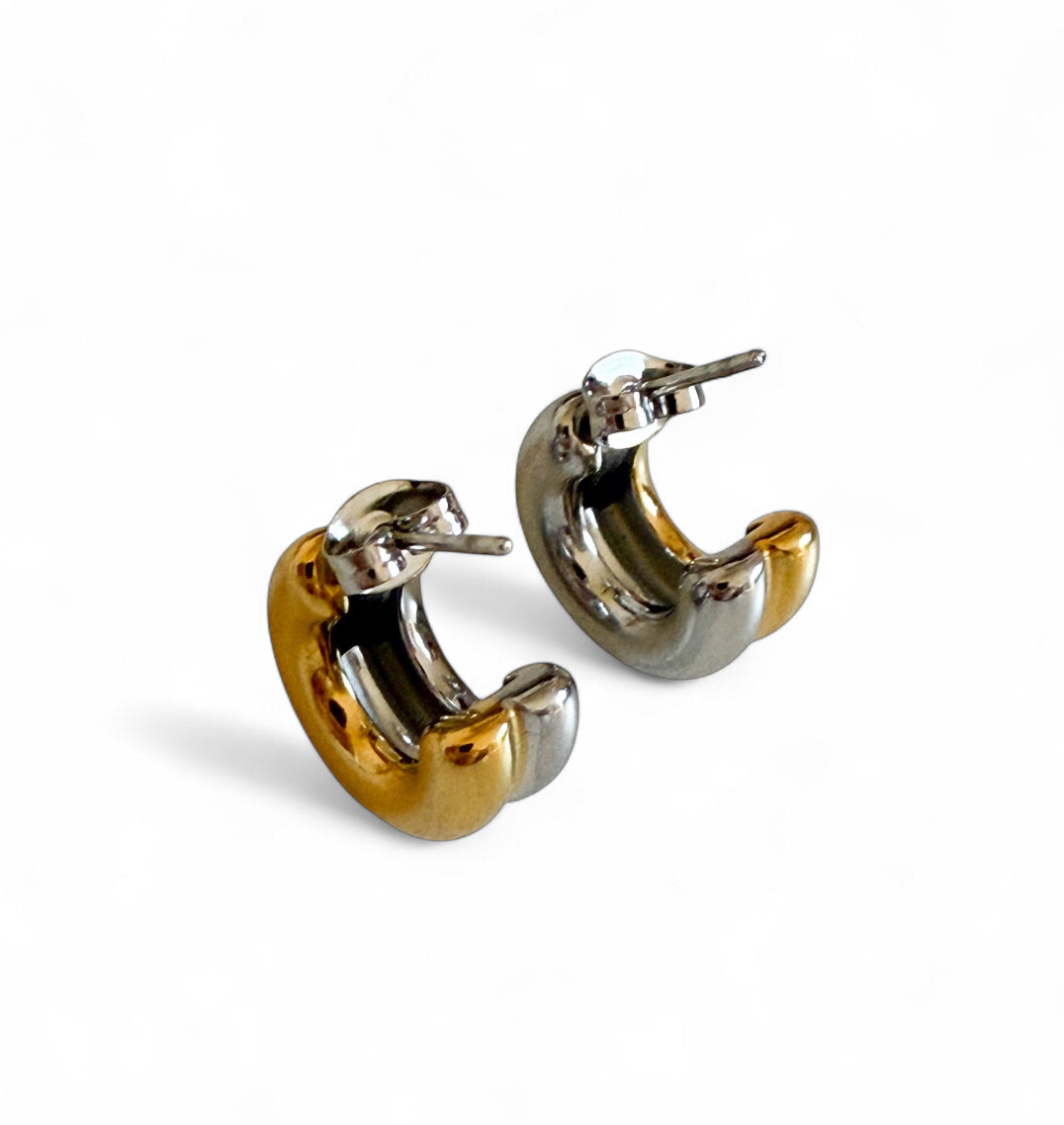 Introducing The Nova Hoop, these sleek, modern earrings feature a beautiful dual-tone mixed metal effect with 18k gold on one side and polished silver on the other, creating a chic contrast that adds depth and sophistication. Designed to curve elegantly around the ear, these stud hoop earrings measure 4cm in length, offering a refined balance between subtlety and style.