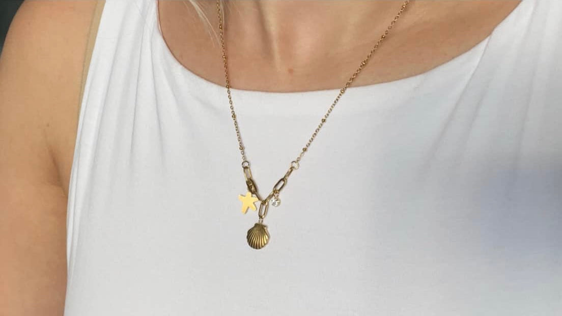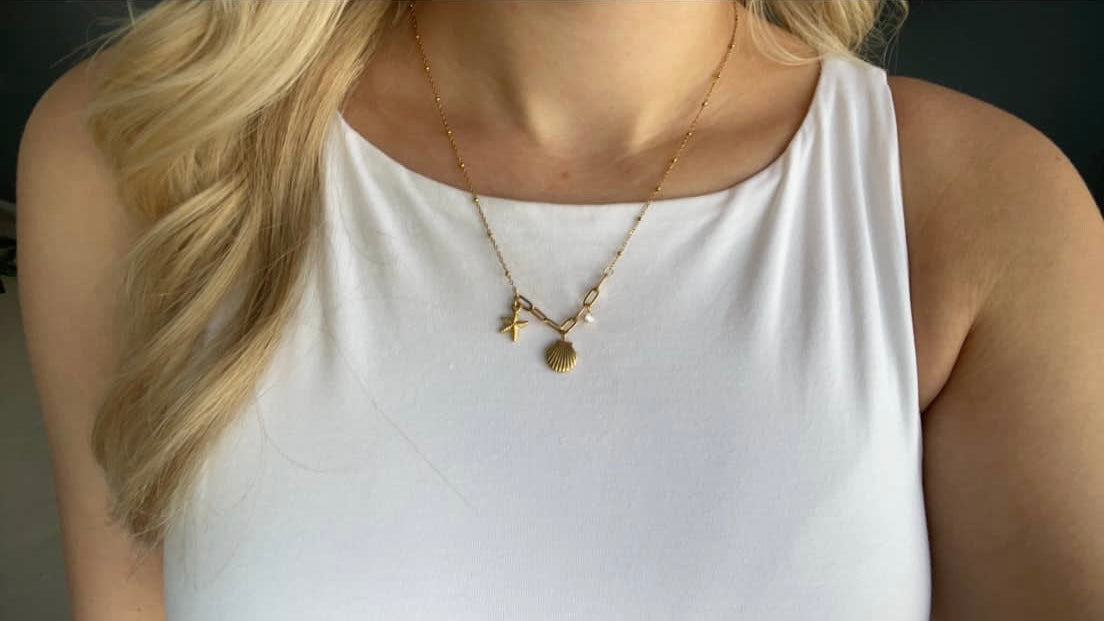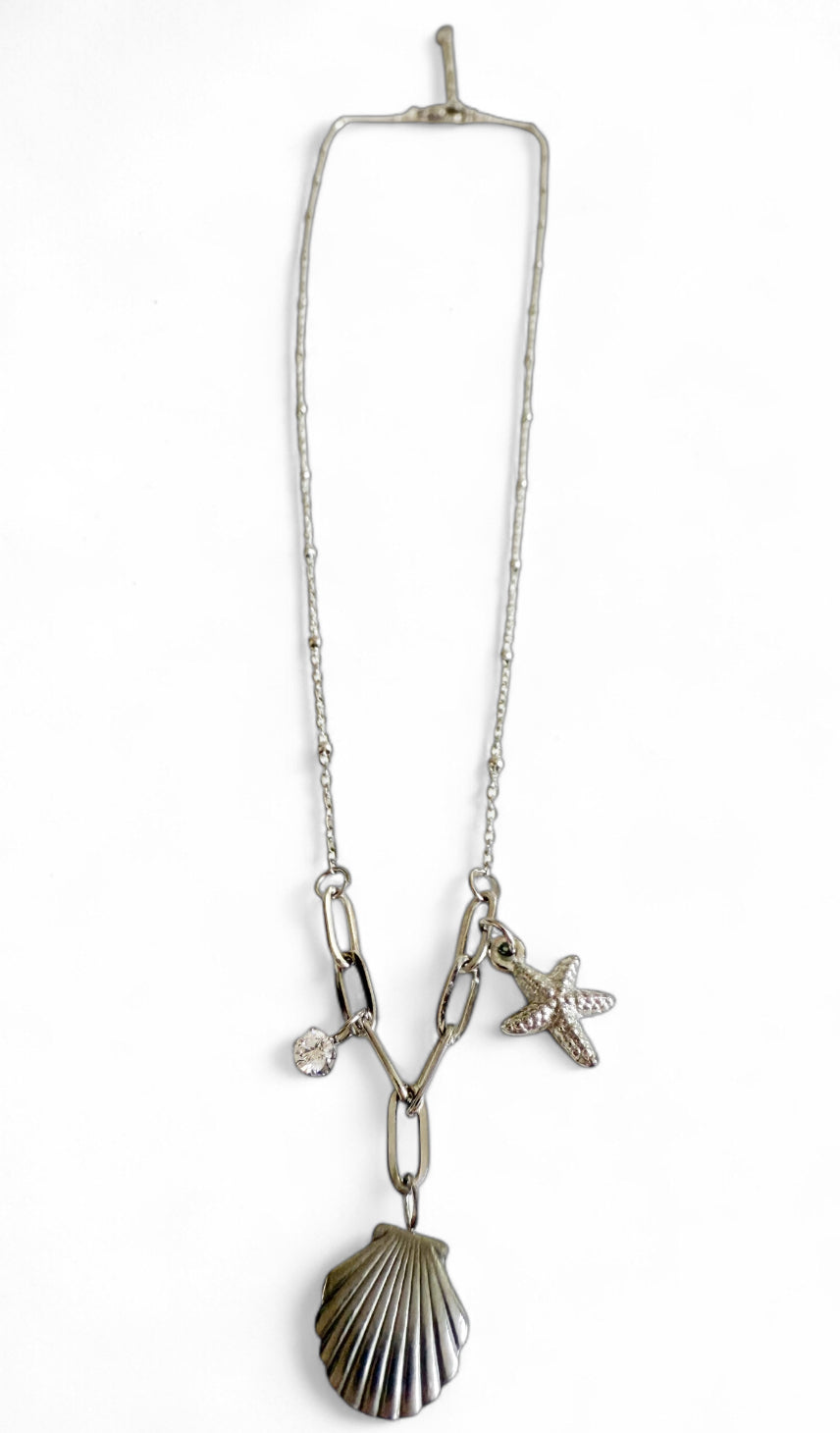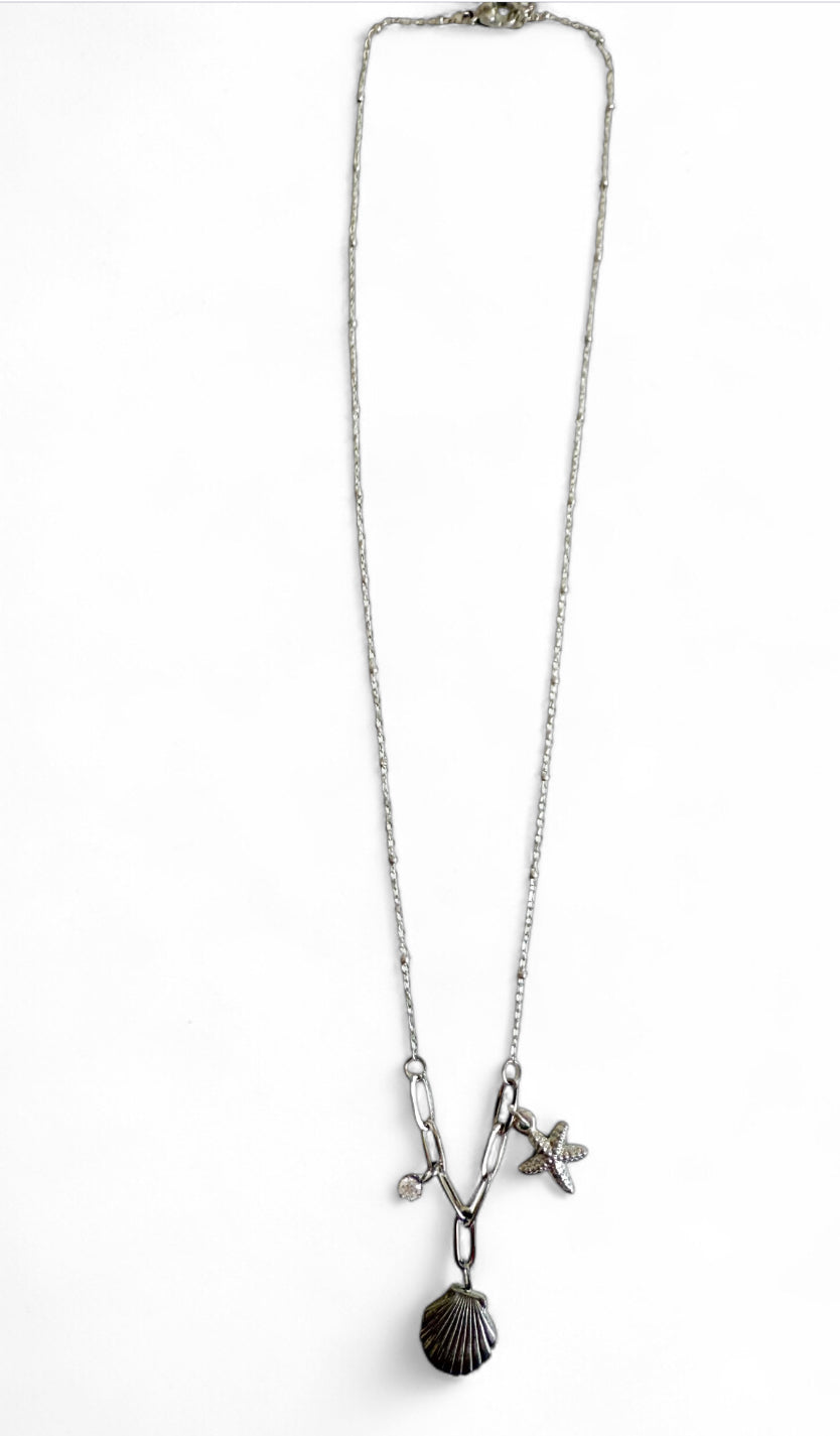 Bring the magic of the sea to your neckline with the Ocean Charm necklace. Crafted from durable stainless steel and available in your choice of 18k gold-plated or polished silver finishes, this dainty chain links together a trio of seaside treasures—a shimmering crystal, a tiny starfish, and a delicate shell charm. Each charm catches the light like sun on waves, offering a subtle nod to beachside serenity. Perfect for layering or wearing solo, it's your everyday escape to the shoreline.